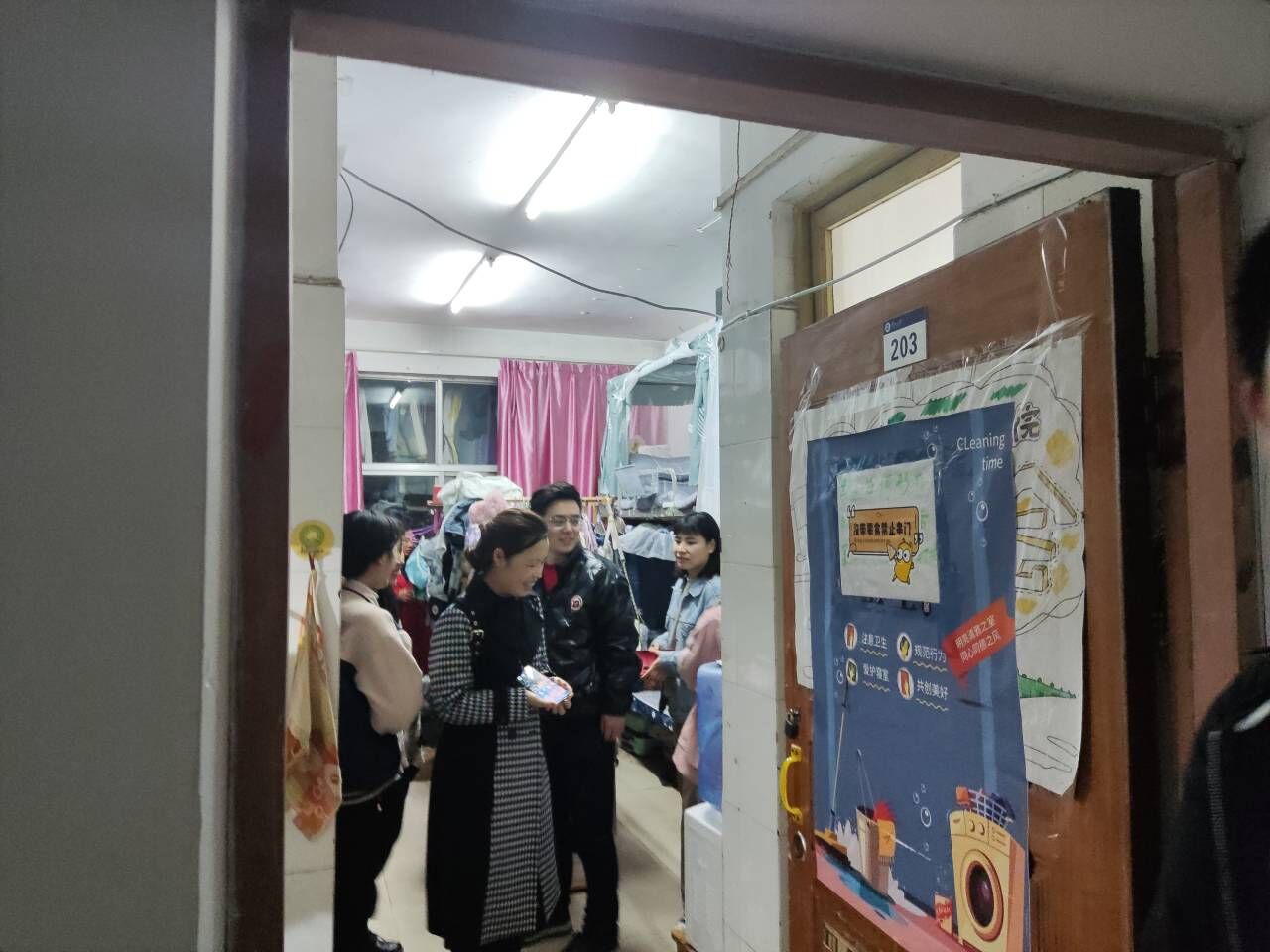 王冰细心检查寝室内是否存在大功率电器使用痕迹,提醒同学们注意插线板的摆放、易燃垃圾的及时清理,再次强调严禁将大功率电器、管制刀具及违禁物品带入寝室,切实保证寝室安全。
