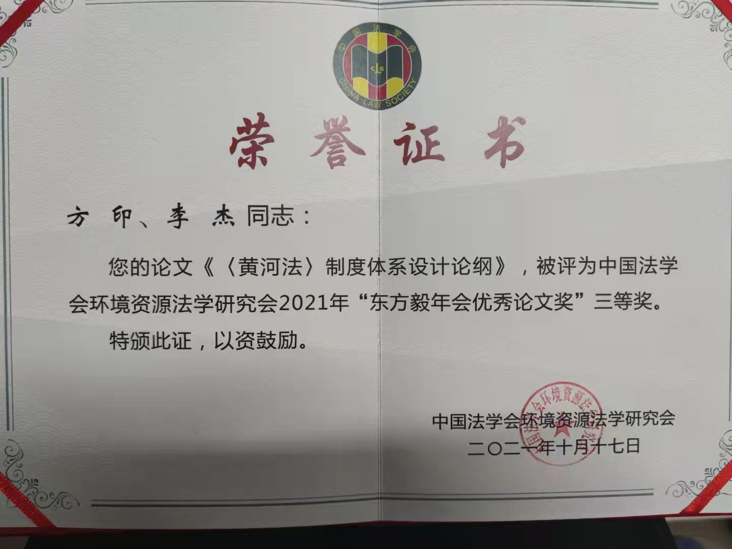 在颁奖环节,大会向第三届阿里巴巴“撷英青年环境法学优秀人才奖”、中国法学会环境资源法学研究会2021年“东方毅年会优秀论文奖”获奖者颁发获奖证书和奖金。其中,方印教授和李杰同学的参会论文《<黄河法>制度体系设计论纲》被评为中国法学会环境资源法学研究会2021年“东方毅年会优秀论文奖”三等奖。