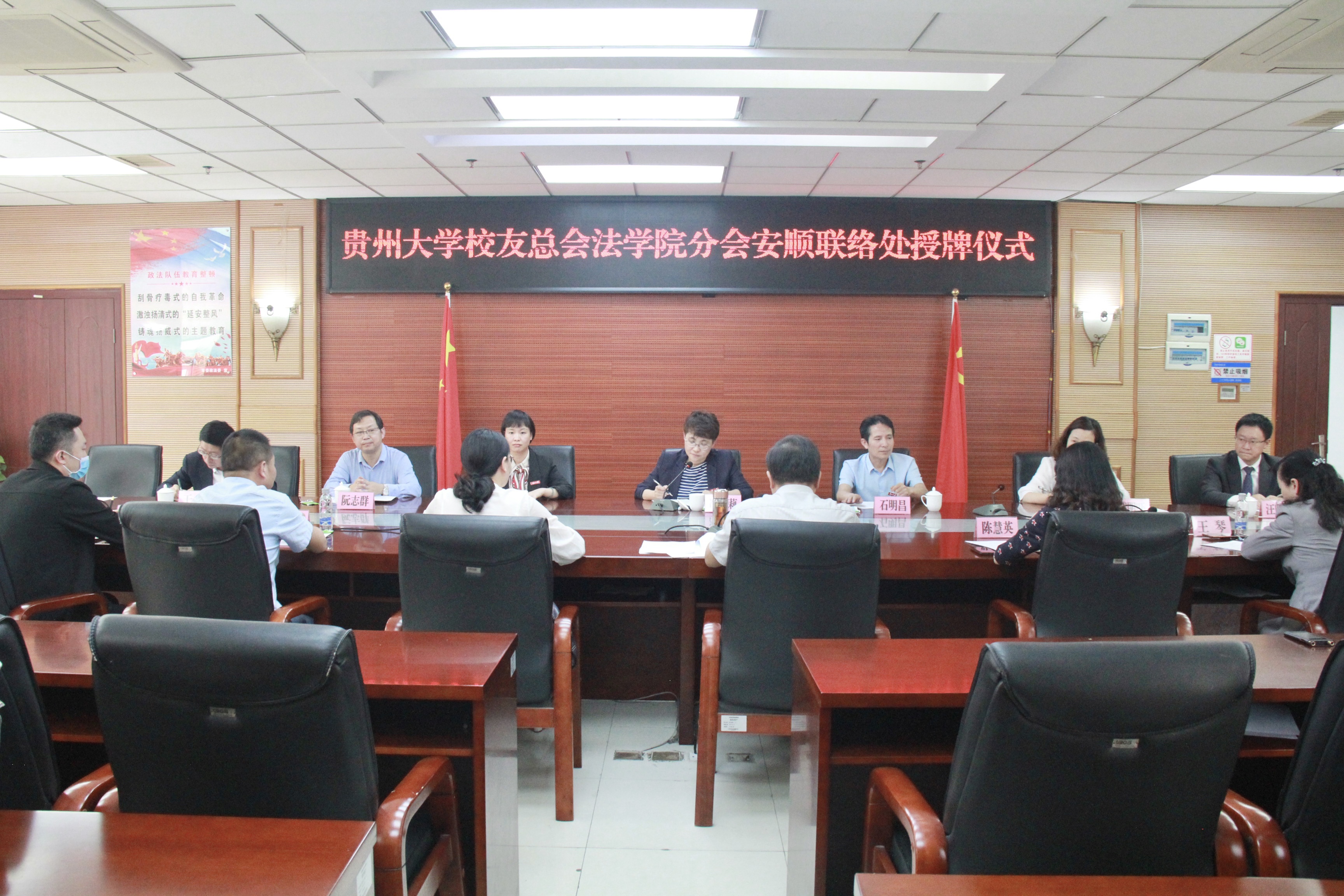 2022年6月15日下午,beat365在线唯一官网校友分会安顺联络处授牌仪式在安顺市法学会会议室隆重举行。安顺市委政法委常务副书记、市法学会副会长、秘书长潘勇,安顺市司法局党组书记、局长王开惠,安顺市中级人民法院副院长、市法学会副会长陈慧英、安顺市人民检察院副检察长彭胜,beat365在线唯一官网院长冷传莉、党委书记石明昌、党委副书记岳莹,部分beat365在线唯一官网安顺校友,beat365在线唯一官网师生代表参加仪式。授牌仪式由潘勇主持。