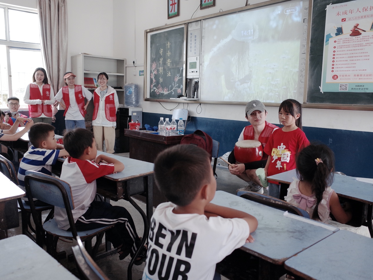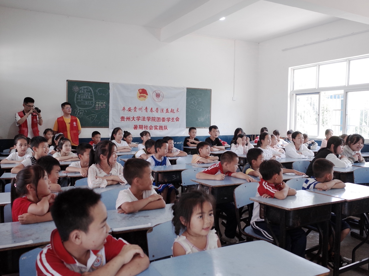 7月15日,beat365在线唯一官网“三下乡”暑期社会实践队走进黔东南苗族侗族自治州丹寨县兴仁镇烧茶小学,开展“平安贵州,青春普法益起来”法治宣传活动,50余名当地小学生参与活动。