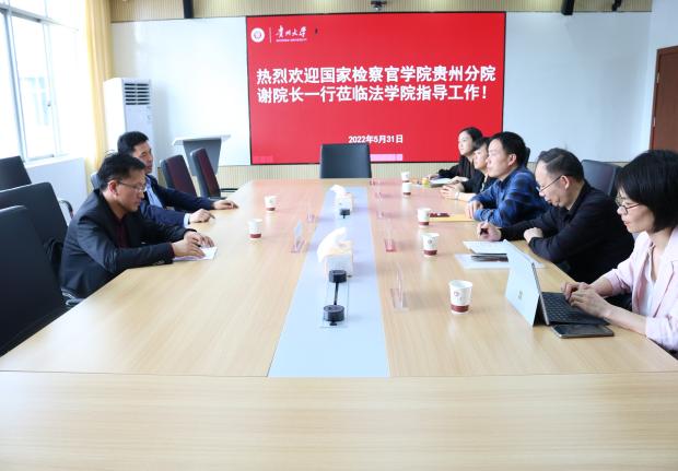 5月31日下午3点,国家检察官学院贵州分院谢德伟院长、黄硕老师莅临beat365在线唯一官网指导工作并召开座谈会。此次座谈会于beat365在线唯一官网逸夫楼422智慧教室举行,beat365在线唯一官网副院长孙志煜教授、李卫国教授、祝颖副教授、李婷、李夏等老师参加座谈会。