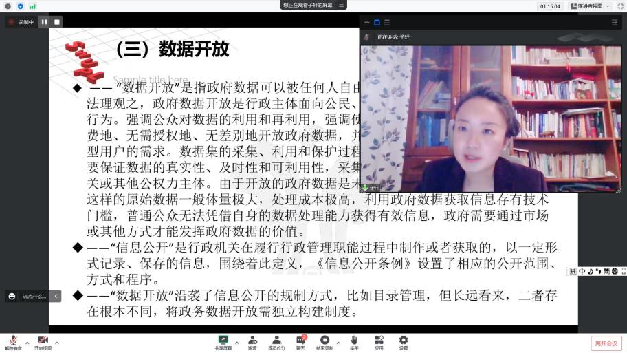 本次讲座主要为五个部分进行。分别是:一、政务数据的相关概念的厘定;二、我国政务数据开放利用的规范现状;三、政务数据开放利用的阻碍与困境;四、域外政务数据开放利用的监管经验;五、我国政务数据利用模式的补正构建。