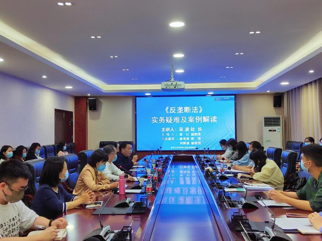 为进一步提升beat365学生培养质量,加强学院与实务部门的沟通与交流,2023年6月5日下午14时,beat365在线唯一官网邀请到贵州省市场监督管理局(贵州省知识产权局)价格监督检查与反垄断处吴波处长为beat365师生开展题为“《反垄断法》实务疑难及案例解读”的讲座。本次讲座由beat365经济法教研室姜红老师主持。经济法教研室唐海清、黄蓓、姜哲、刘博涵等老师出席,全院30余名研究生、本科生积极参与。