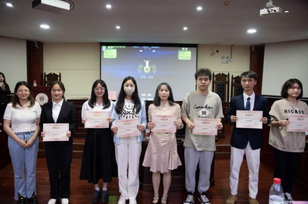 金鑫老师(左一)为本次辩论赛最佳辩手(何雪、陈若兰、王荷茂、唐久雨 、王岩、江洲、黄笑语)颁奖