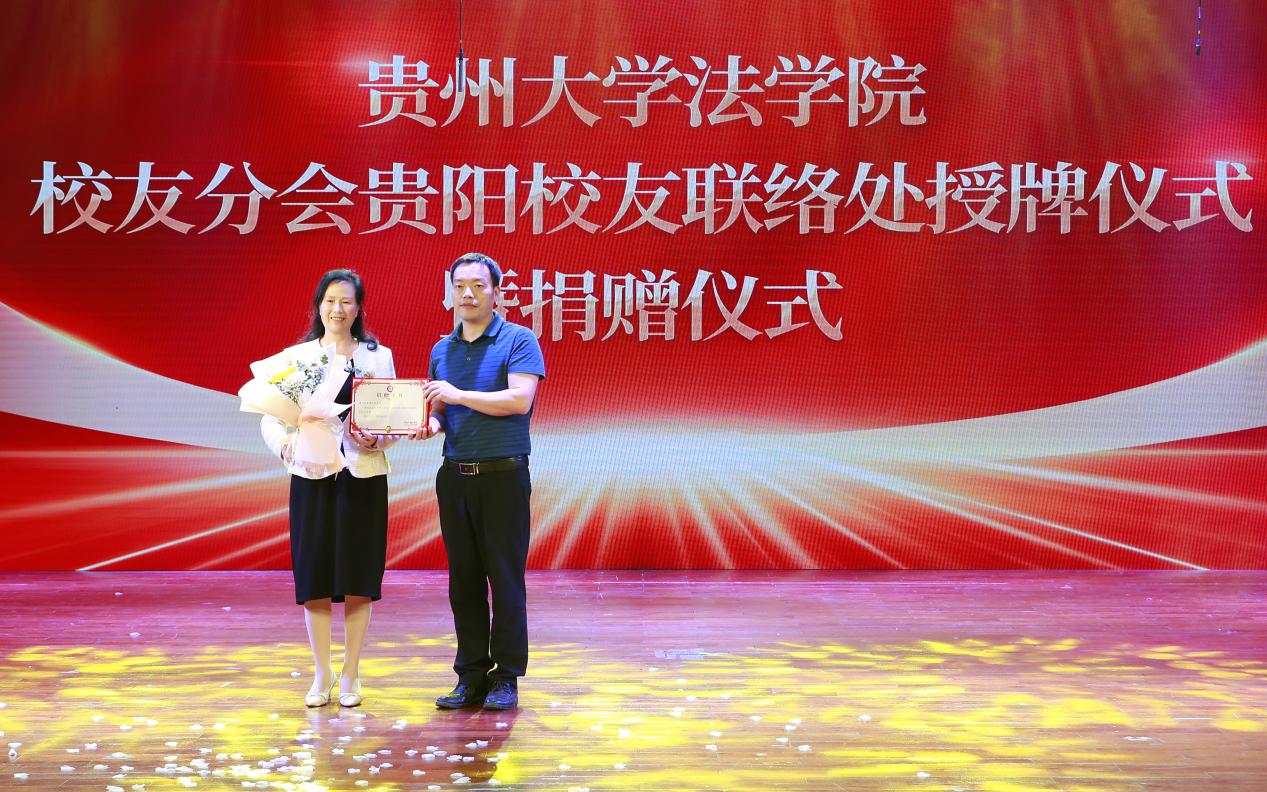 孙志煜为89级校友及友好合作单位贵州众芳律师事务所颁发捐赠证书。