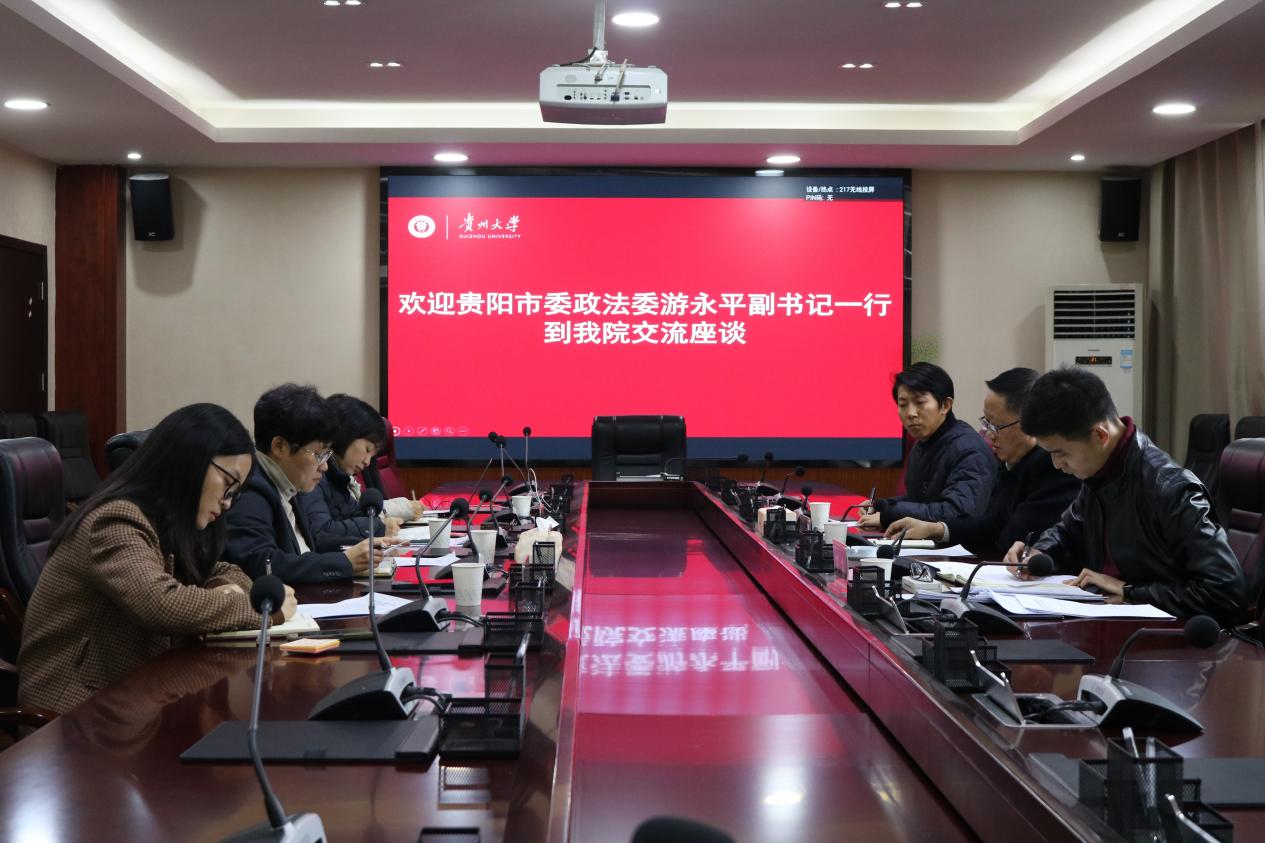 为充分发挥贵阳市委政法委、beat365在线唯一官网丰富的实践和理论资源优势,努力培养高素质法律人才,推进法学教育和法学实务的紧密结合。11月14日,贵阳市委政法委副书记游永平,市委政法委执法监督处处长罗鑫、三级主任科员田镇华一行到beat365进行交流座谈。beat365在线唯一官网院长冷传莉、党委副书记岳莹、办公室主任李夏、教学科研科科长杨智婷参加座谈。