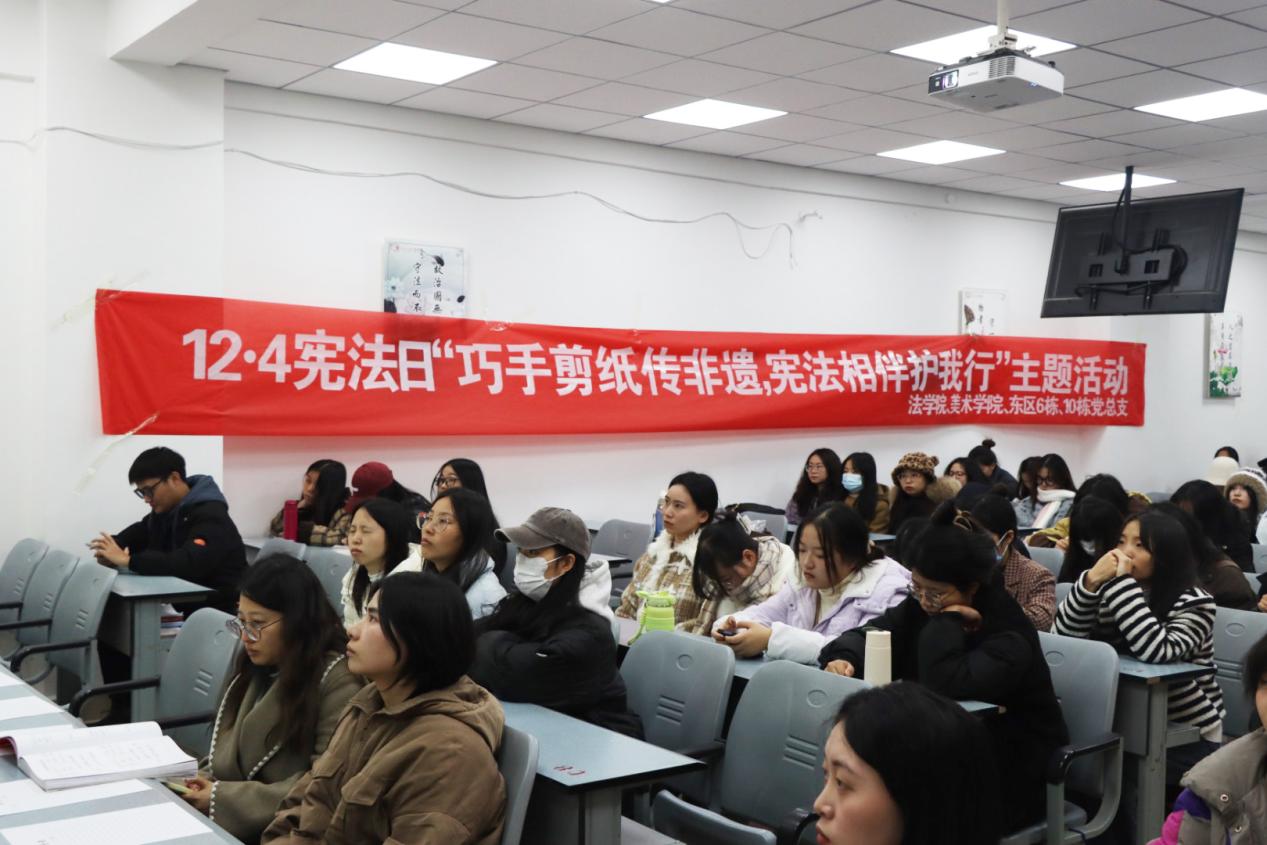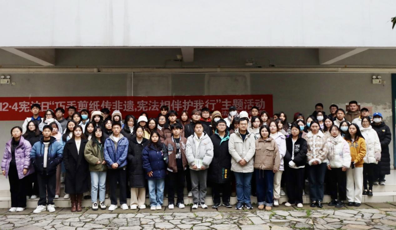 宪法是国家的根本大法,是治国安邦的总章程,具有最高的法律效力。为了弘扬宪法精神,树立宪法权威,增强法治观念,调动同学们学习宪法的积极性,引导同学们自觉成为宪法忠实的崇尚者、自觉的遵守者和坚定的捍卫者,beat365在线唯一官网、美术学院于2023年12月4日“国家宪法日”,联合举办“巧手剪纸传非遗,宪法相伴护我行”主题活动,美术学院龙翔老师、beat365在线唯一官网学生科科长贺明吓老师、辅导员谭璐老师、金鑫老师参加此次活动。