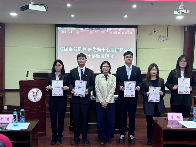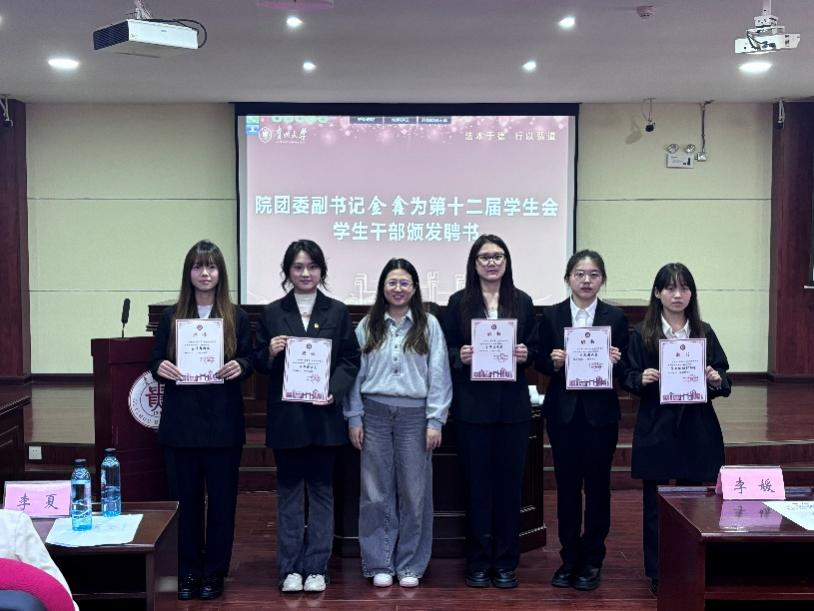 金鑫为第十二届学生会干部颁发聘书,谭璐为第十七届研究生会干部颁发聘书,以示勉励。